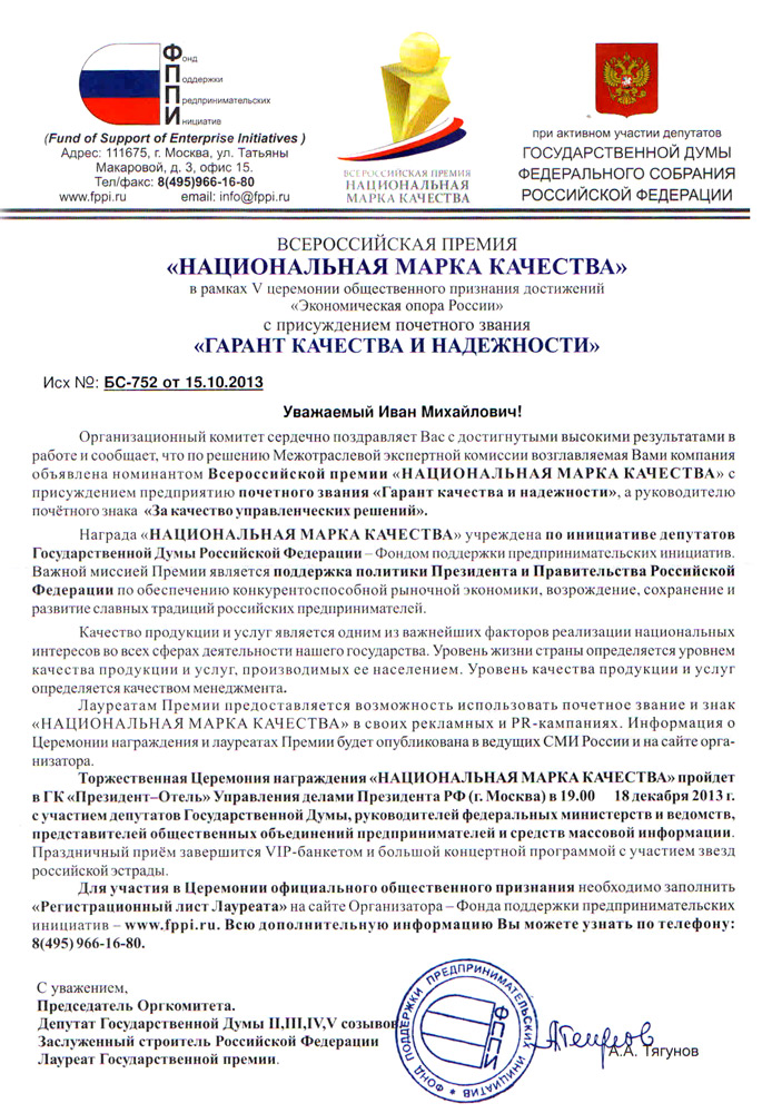 Желаем Вам и Вашему коллективу успехов в дальнейшей работе»